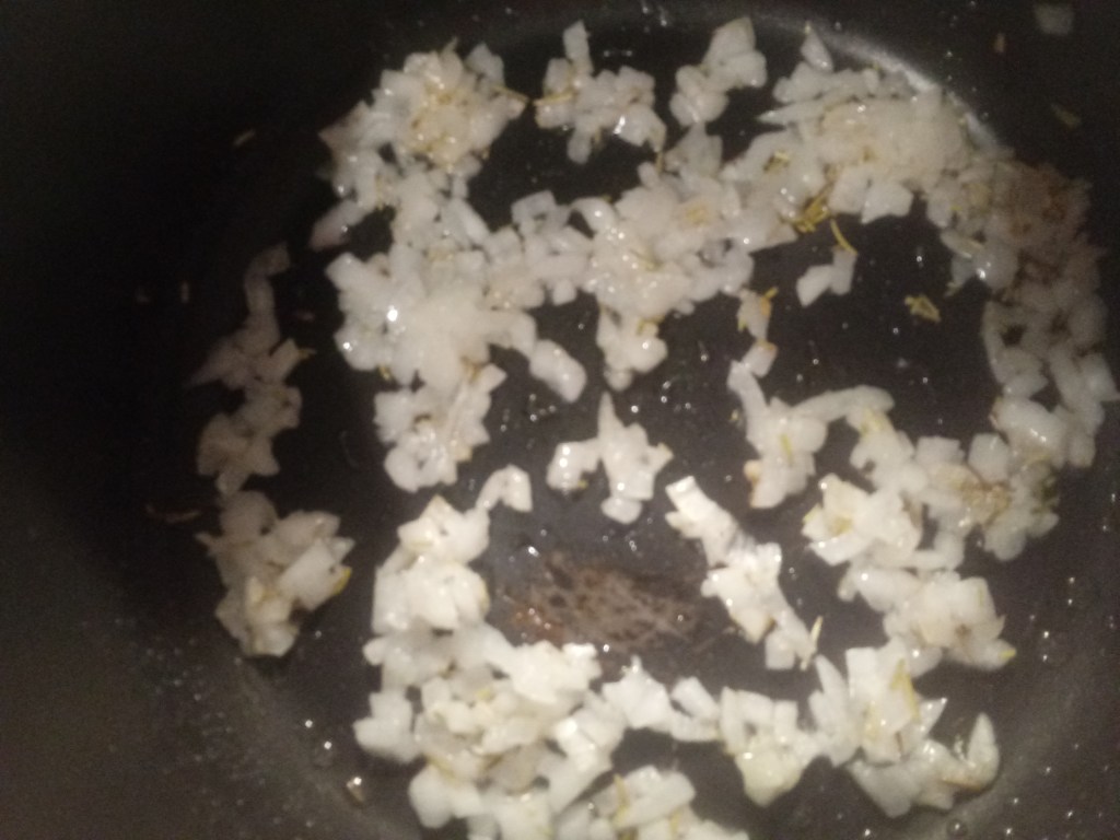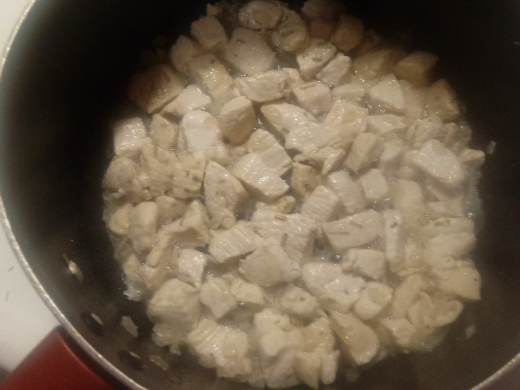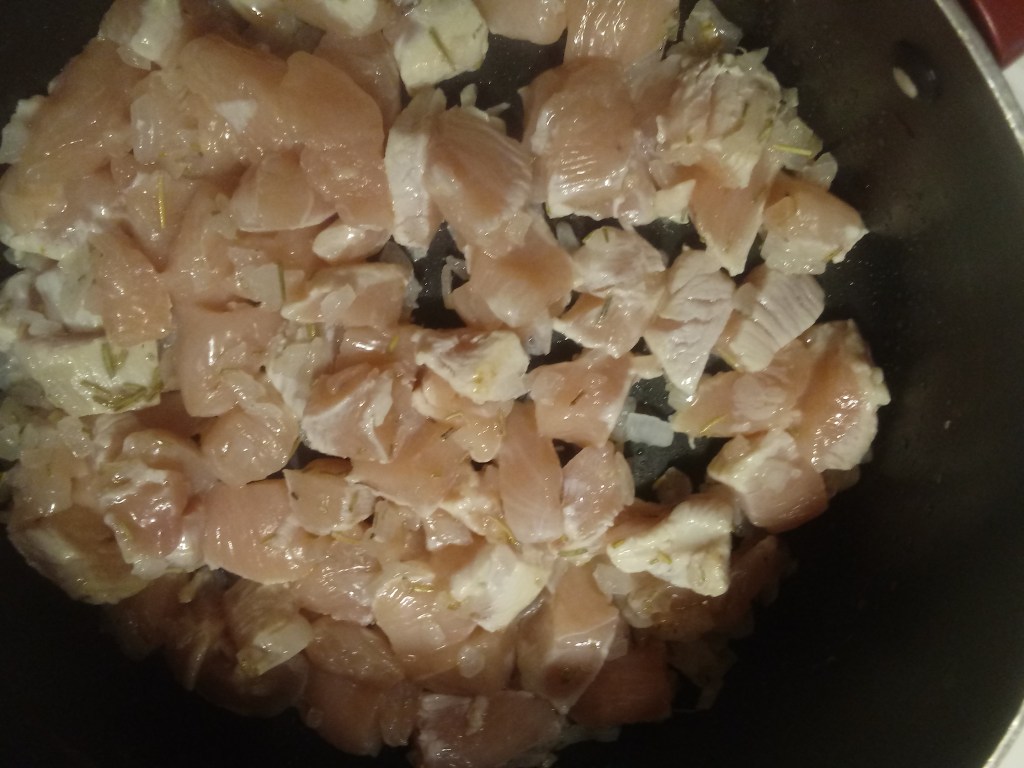 In a skillet or saucepan, over medium heat, pour in the oil and then stir in the onion and rosemary. Stir often until the onion is translucent (clear) and soft. Add in the chopped chicken and saute until the chicken is fully cooked, stirring frequently. Set aside.