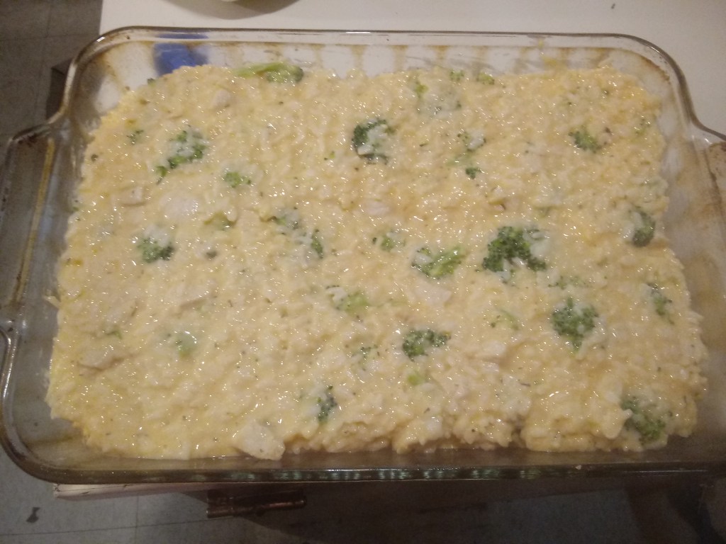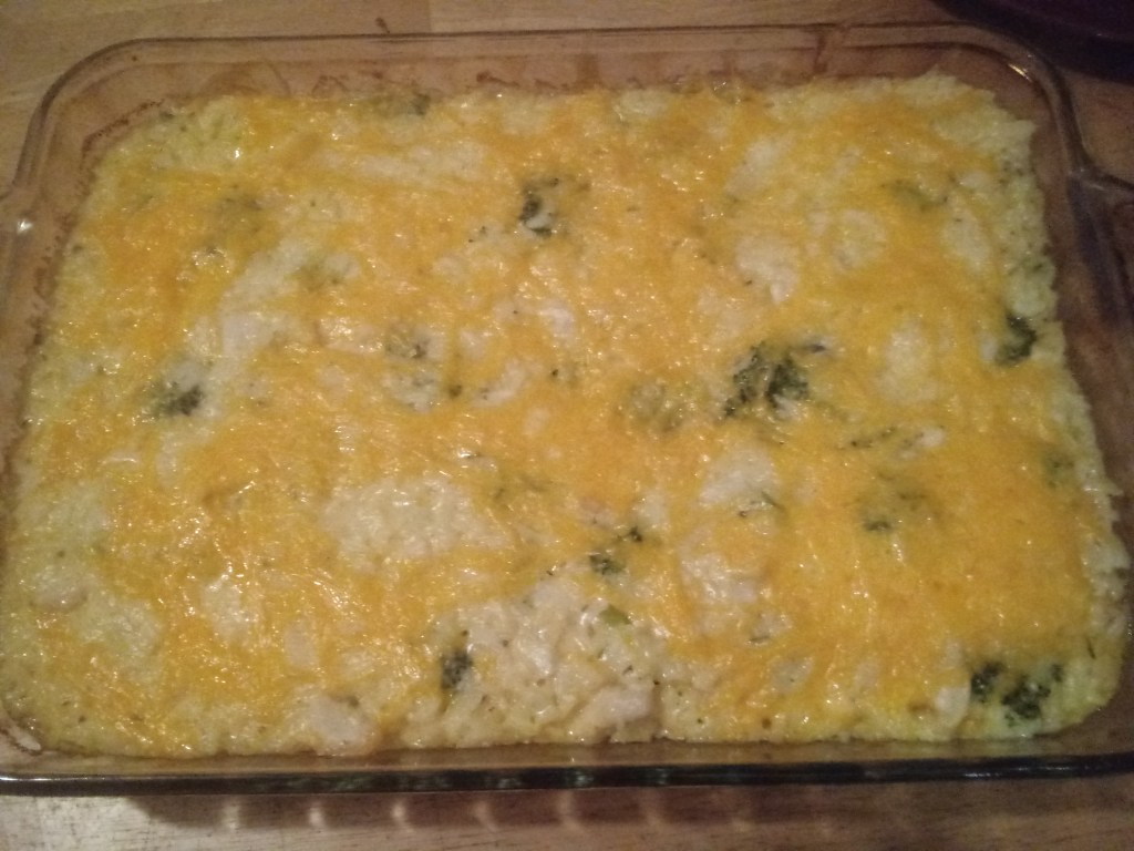 In a large mixing bowl, combine the rice/broccoli combination, the chicken, and the cheese sauce. Stir it well to make sure it is all evenly distributed. Dump this mixture into the prepared baking dish and smooth out the top. Cover and bake for 30 minutes. After the 30 minutes, remove the cover and sprinkle the top with the remaining 2 oz of shredded cheese. Bake uncovered for 10 minutes. Allow it to sit for a couple of minutes before serving.