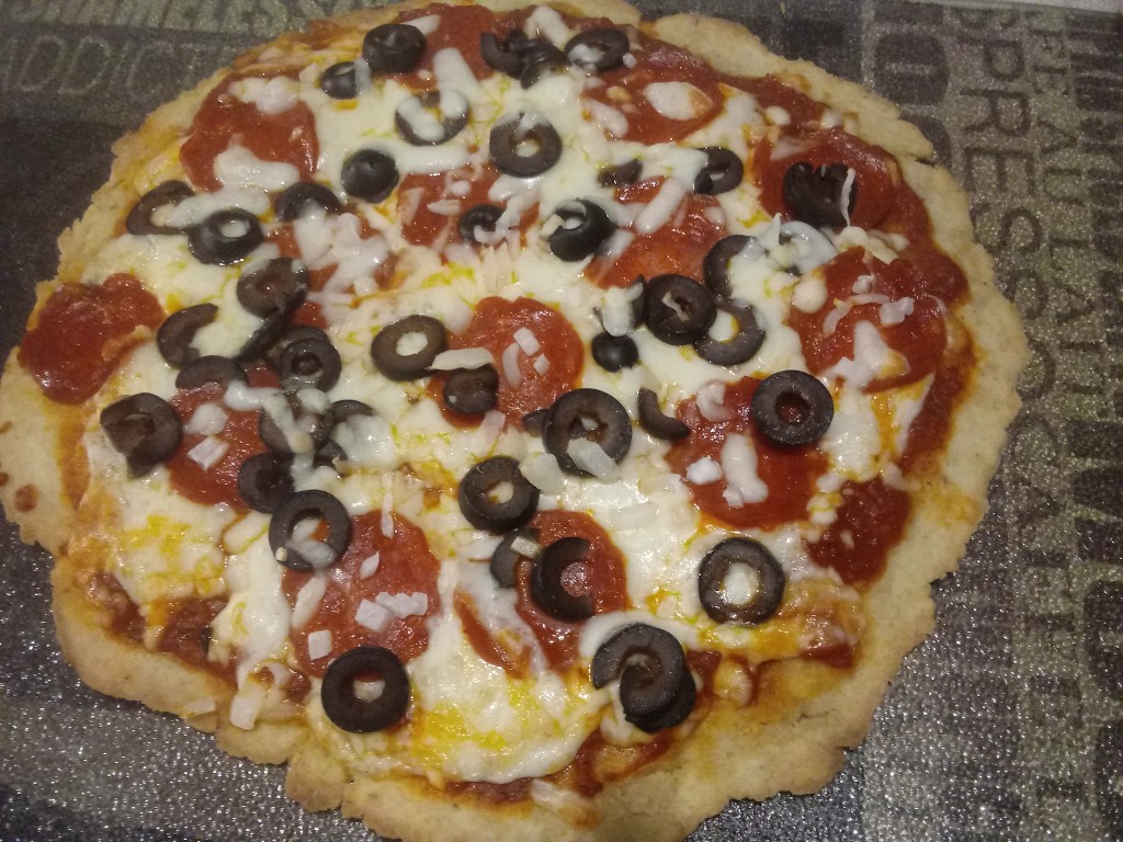 A gluten-free pizza that my husband whipped up for himself. Not perfectly round, but beautiful in its imperfections.