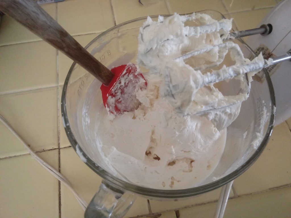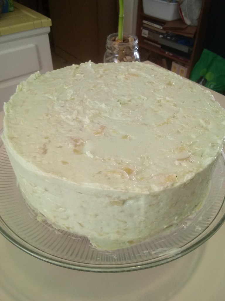 The cake I made was from a mix, I admit. Aldi has a Gluten-free key lime cake mix which I used. I made two boxes of it to get two layers, and added an extra egg because when I made it in the past, it was drier and more crumbly than was tolerable. The extra egg seemed to help quite a bit. If you have never been to an Aldi, they are a nice little store and have some really great quality gluten-free products. They also are a lot less expensive for many things and I almost exclusively buy dairy products there. It is worth it to check it out if you need to be gluten-free or you just want to save some money. (If you go, grab a macaroni and cheese pizza if they have it in stock. They are AWESOME!)